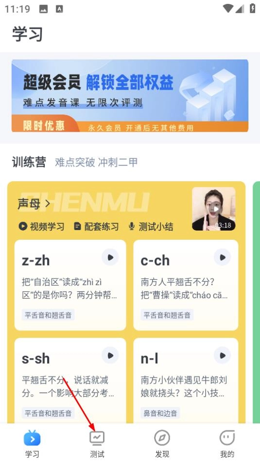 1、打开普通话练习应用,点击页面底部的“测试”按钮,进入测试界面。