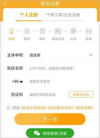 选择个人或商户身份,接着选择主体申明,输入店铺名称、手机号码和验证码后,点击下一步并根据后续提示完成操作,就能成功开店了。