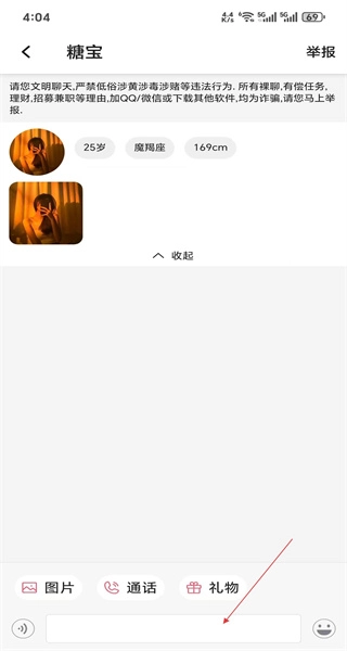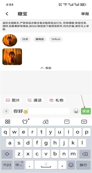 进入和糖宝的聊天界面,能看到对方的资料信息,底部设有图片、通话等功能按钮,现在激活输入框,准备开始交流。