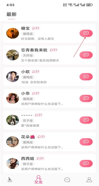 打开软件后,进入最新列表页面,能看到糖宝等用户发布的动态,点击糖宝对应的聊天按钮,即可进入与糖宝的对话页面。
