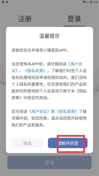 在阅读《用户协议》和《隐私政策》后,点击【理解并同意】按钮,即表示您确认同意相关协议,从而可以使用小猪逛街的服务。