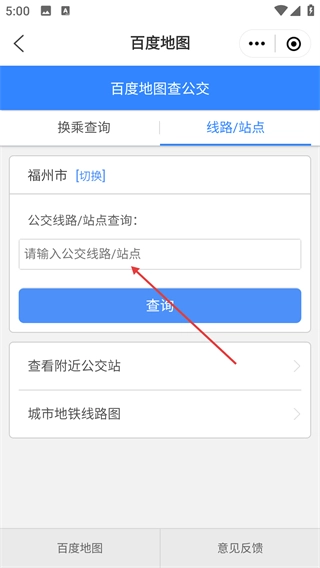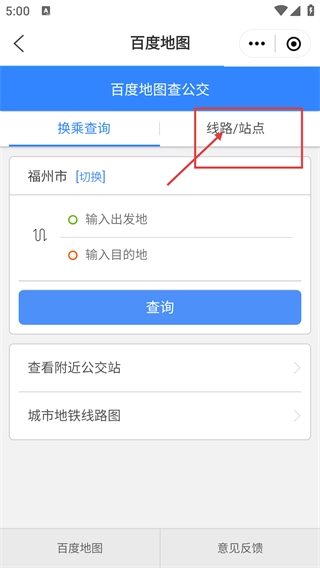 进入百度地图的公交查询页面后,点击【线路/站点】标签,即可从默认显示的换乘查询界面切换到公交线路/站点的查询界面。