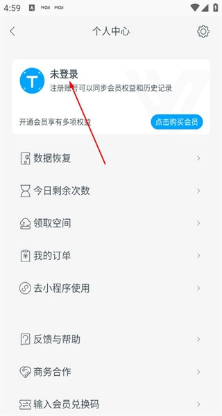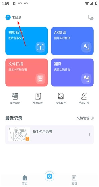 打开软件后,进入首页,能看到拍照取字等功能选项,接着点击左上角显示“未登录”的区域,即可进入个人中心页面。
