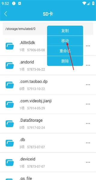 在弹出的功能菜单里点击移动选项,以便把这个文件夹转移到别的存储位置。