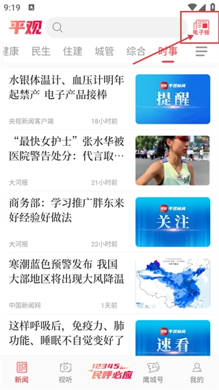 在【平观】新闻页面,点击右上角的【电子报】按钮,就能进入电子报板块,浏览报纸类的资讯内容。