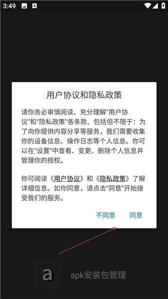 安装结束后打开应用,需要在用户协议与隐私政策页面点击同意,认可相关条款后才可进入应用。