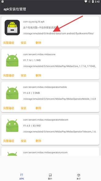 应用列表展示多个安装包,包含名称、版本和路径信息,支持安装与删除操作,便于用户对手机应用安装文件进行管理。