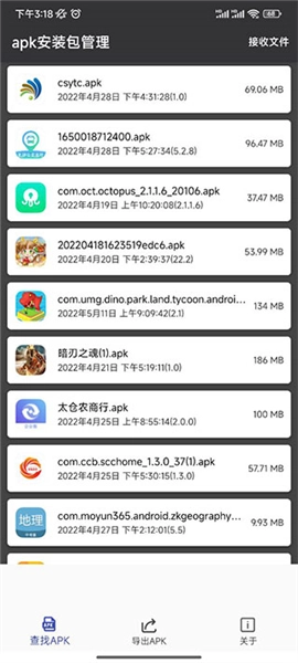 进入APK安装包管理界面后,在页面下方能看到查找APK、导出APK和关于这三个功能板块,通过这些板块可以找出你手机中不存在的安装包。