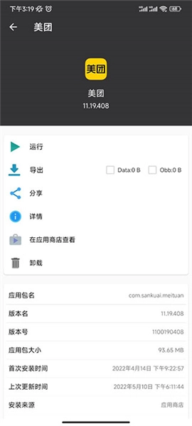 在手机的安装包管理界面,你既可以直接运行启动应用,也能进行导出和分享操作。