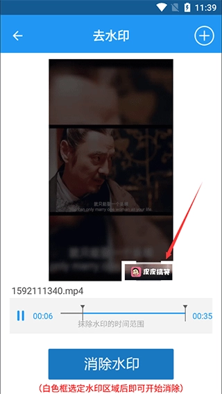 3、选好视频后会进入操作界面,你可以拖动视频画面里的白框,把它缩小、移动,直到框住水印所在的区域(白框一开始在视频正中间,得先把白框移到水印区域再进行后续操作,要是不移动就直接操作,很容易让整个视频变模糊)。另外,通过下方的时间进度条,还能选择需要抹除水印的时间段,选好后点击下方的“消除水印”按钮就行。