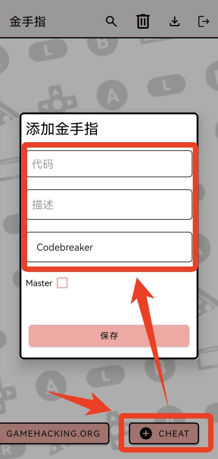 2、点击右下角【+CHEAT】,输入代码等信息,点击保存。