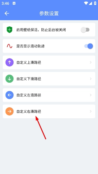 2、进入【参数设置】页面后,可开启【启用壁纸保活】功能以防止壁纸在后台被关闭,还能开启【是否显示滑动轨迹】选项,并且支持对各个方向的滑动路径进行自定义设置。