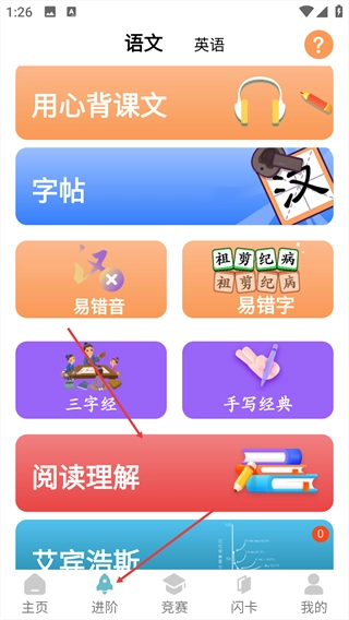 1、在【进阶】页面,找到【阅读理解】选项并点击。