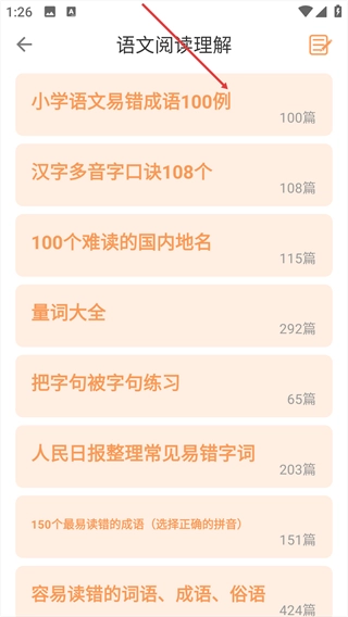 2、打开阅读理解页面,选择【小学语文易错成语100例】这个选项。