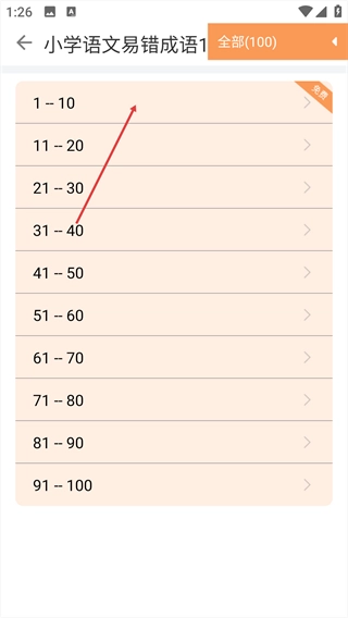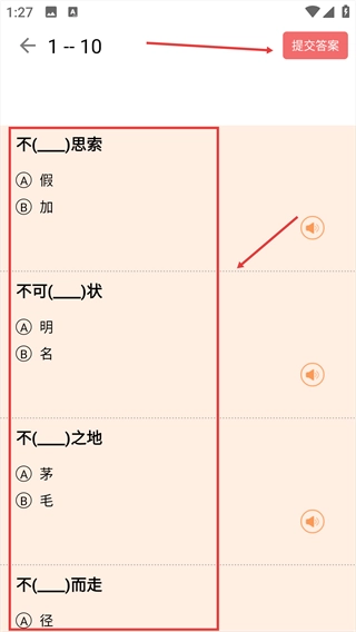 3、点击【1--10】批次选项,进入对应的练习题目页面。