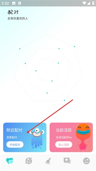进入【配对】界面后,选择【附近配对-游客配对】这一选项,接着点击【开始配对】按钮,就能参与配对互动了。