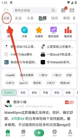 1、进入软件首页后,在导航栏找到话题”选项,点击该选项即可进入话题页面。