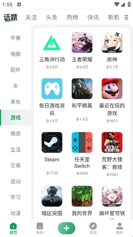 2、接着在话题”板块里找到游戏”分类,就能看到这里汇聚了不少热门游戏。