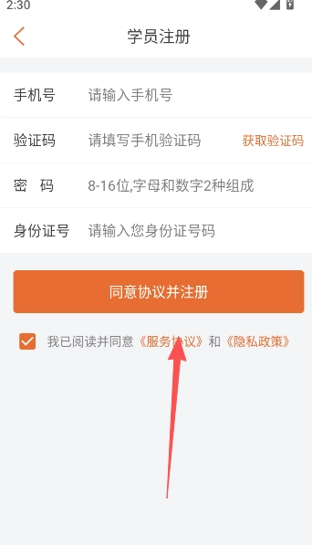 完整填写学员注册信息部分,点击同意协议并注册进入。