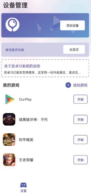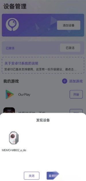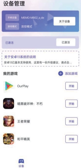 设备蓝灯长亮时,说明已识别到手柄;游戏模式显示为“双控模式”,则代表设备已成功连接。此时激活状态若显示“未激活”,您可以通过扫码查看详细的视频激活教程,完成激活后点击“开始游戏”即可进入游戏。