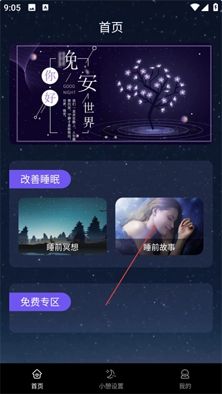 进入【首页】后,找到【改善睡眠】板块,点击其中的【睡前故事】选项,即可进入对应功能页面。