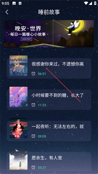 在【睡前故事】列表页面,能看到多篇标注了时长的故事内容,选中想要的故事条目并点击,就能进入详情页面。