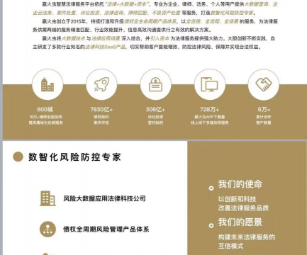 赢火虫诉讼投资服务平台,聚焦“诉讼投资”核心业务,采用“先胜诉、再回款付费”的商业模式,有效降低当事人在诉讼或仲裁过程中的风险,同时将各方利益紧密绑定,进而提升案件处理的整体效率,最终达成多方共赢的目标。平台持续推进产品与服务的创新升级,逐步构建起涵盖债权监测、案件诊断、律师精准匹配、诉讼资金支持、案件执行跟进以及债权资产销售六大模块的债权全生命周期服务体系。此外,平台创新性地融合“互联网+”理念与大数据技术,自主研发了一系列科技支撑系统,为案件的胜诉结果及后续执行回款提供了坚实可靠的保障。