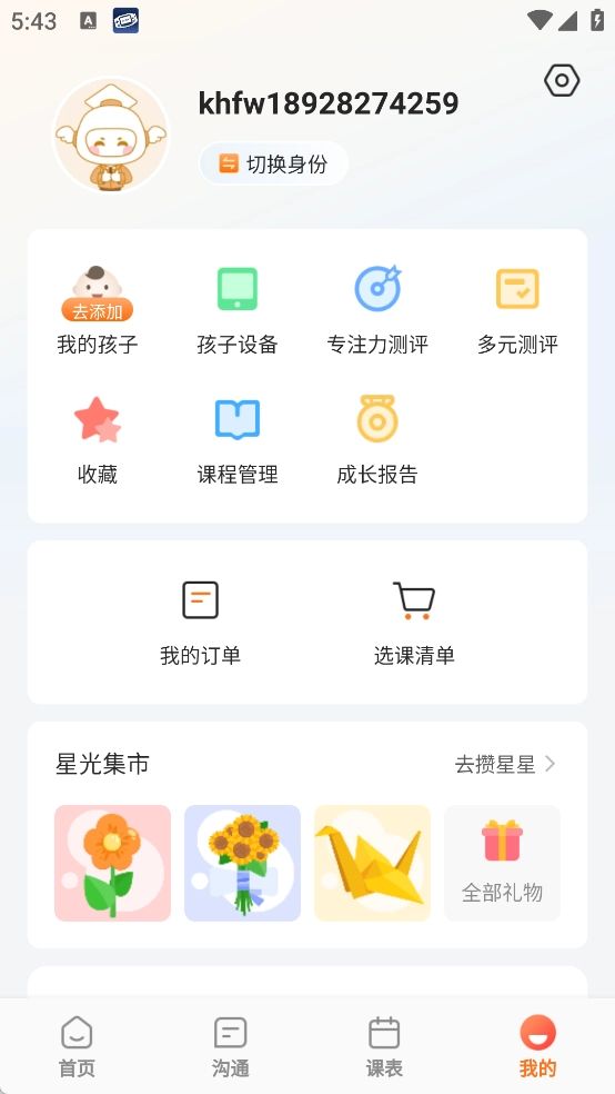 可以集中管理孩子的各类信息、使用的设备、参与的测评、学习的课程以及相关订单等内容,此外还有星光集市,可在其中兑换礼物。