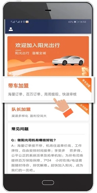 打开阳光出行车主端应用,进入启动页面后,先填写手机号完成注册流程,接着找到并点击“带车加盟”选项,随后按要求填写相关资料并提交即可。