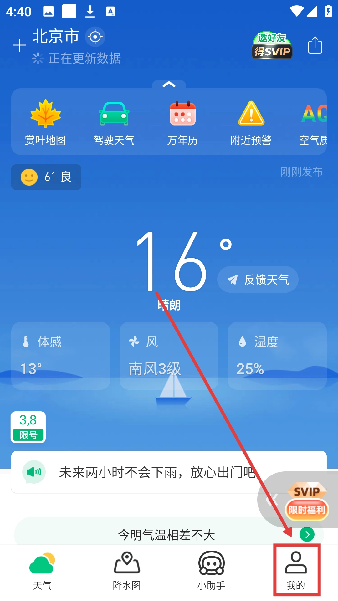 1、在天气首页,点击底部的【我的】选项,就能进入个人中心页面,为设置天气提醒订阅做好准备啦。