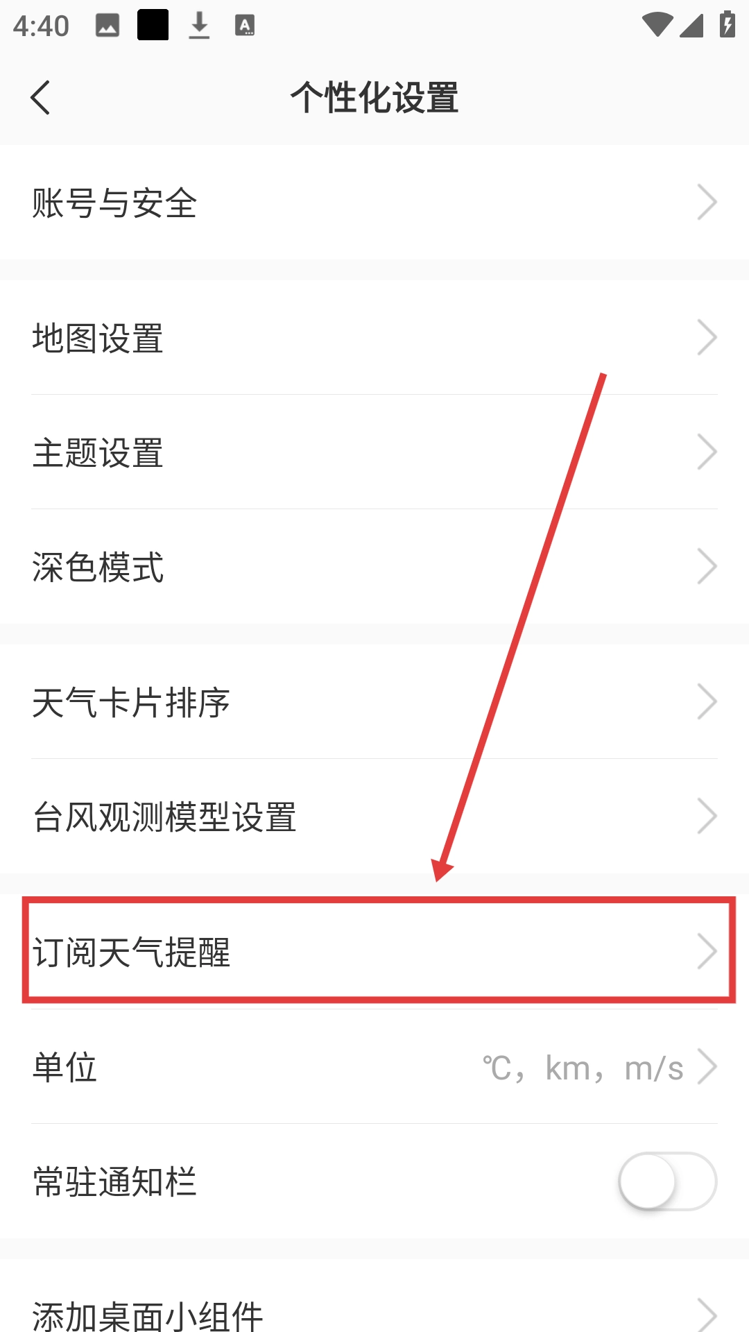 3、进入个性化设置页面后,点击【订阅天气提醒】选项,就能进入到提醒设置页面了。