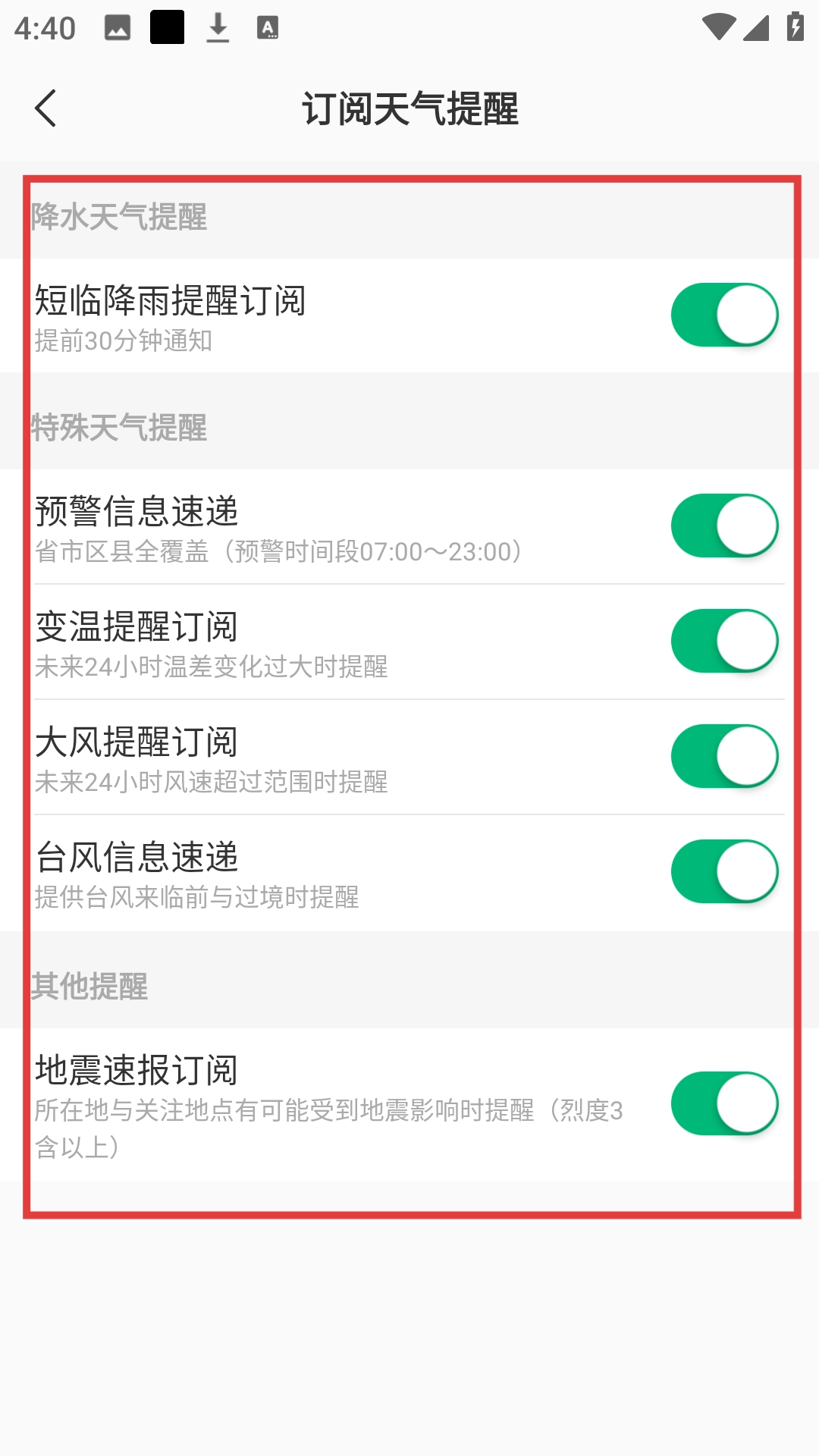4、进入订阅天气提醒页面后,你可以开启短临降雨、预警信息等各类天气提醒功能,这样就能及时了解天气变化情况啦。