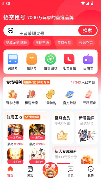 悟空租号是一款专注于游戏账号交易的游戏助手软件,这里汇聚了各类热门新游的账号资源,无论是新手号还是大佬号,都能任你挑选和交易。账号定价公开合理,让你轻松拥有优质的租号、购号体验,畅玩心仪账号,尽享各种福利。平台不仅支持账号租赁与购买,还能帮你把闲置游戏账号变现,助力你获取更多收益。有需求的朋友不妨来这里看看!