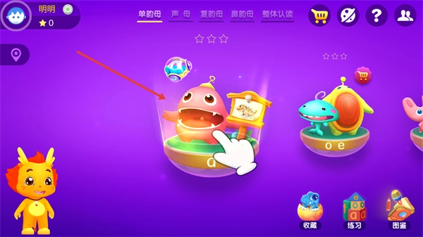 在拼音学习主界面,找到【单韵母】分类并点击其中的目标元素,即可进入该韵母对应的互动学习场景。
