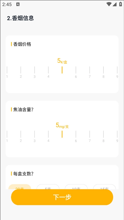 第二步用户需填写常抽香烟的相关信息,包括价格、焦油含量、支数等内容。