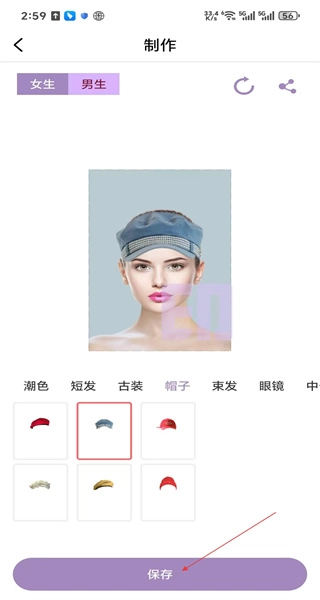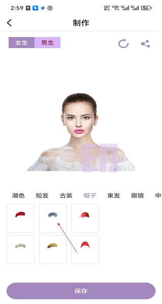 进入制作界面后,底部会呈现潮色短发之类的装扮类别,接着挑选帽子对应的具体样式,就能查看该样式在模特形象上的展示效果。