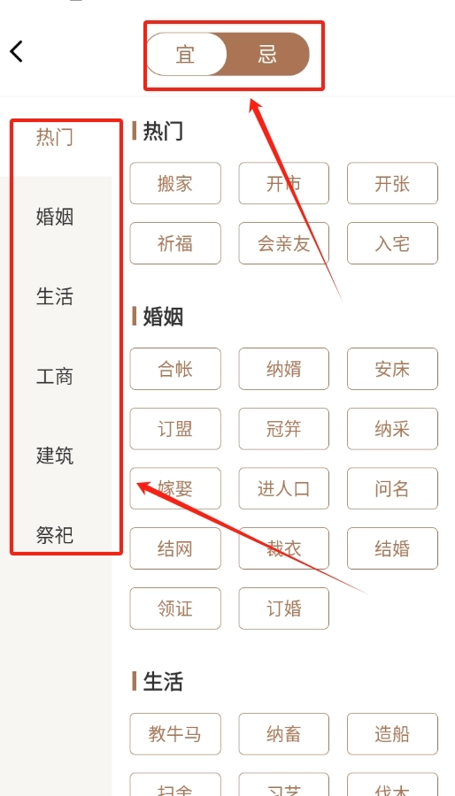 3、轻点首页右上角,即可根据实际需求,为家中事务挑选合适的吉日。
