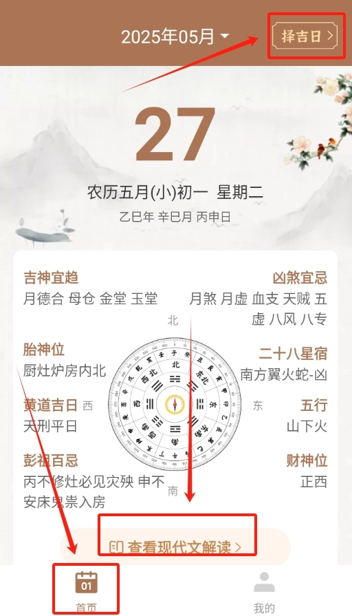 打开天天福历软件后,在首页就能轻松查看传统黄历。