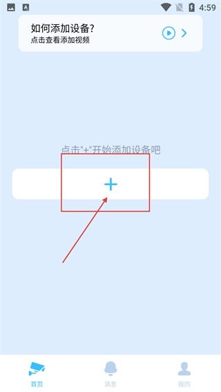 登录后进入设备管理首页,点击页面上的“+”按钮,即可启动设备添加流程;若有操作疑问,还能点击“如何添加设备?”查看对应的视频教程。