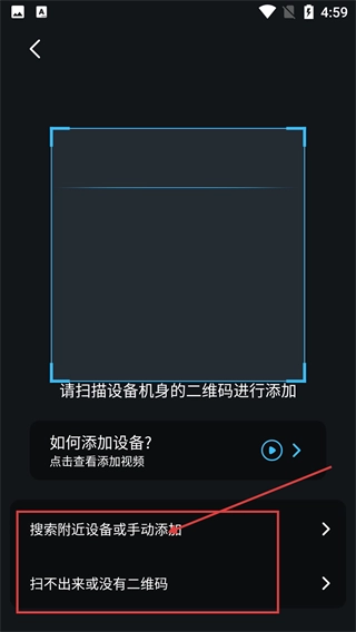 在设备添加页面,系统默认提供扫描设备机身二维码的添加方式;若操作中遇到问题,可通过选择“搜索附近设备或手动添加”选项,切换至相应的添加模式。