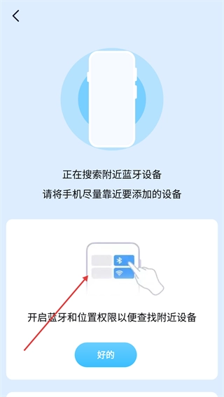 当选择搜索附近设备的选项后,需要先开启手机的蓝牙功能以及位置权限,接着把手机靠近想要添加的设备,此时系统就会自动开始搜索周边的蓝牙设备。