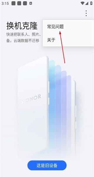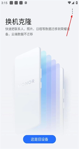 打开软件后,此页面会说明可迁移联系人等数据,点击页面右上角的三点图标,即可展开操作菜单。