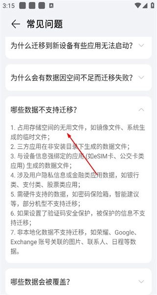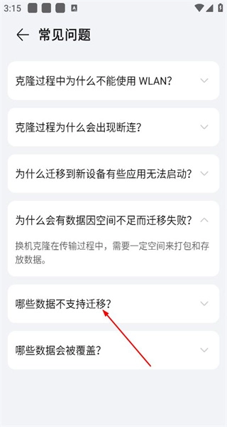 进入常见问题页面,浏览问题列表,挑选“哪些数据不支持迁移”这一问题,准备查看其详细说明。