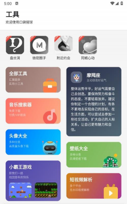 工具类应用里包含了大量实用的小工具,像音乐搜索、头像大全之类的都有。