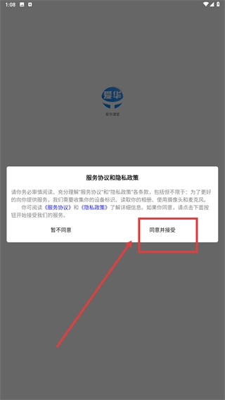 在服务协议与隐私政策的弹窗中,点击【同意并接受】按钮,就能进入应用使用相关功能。