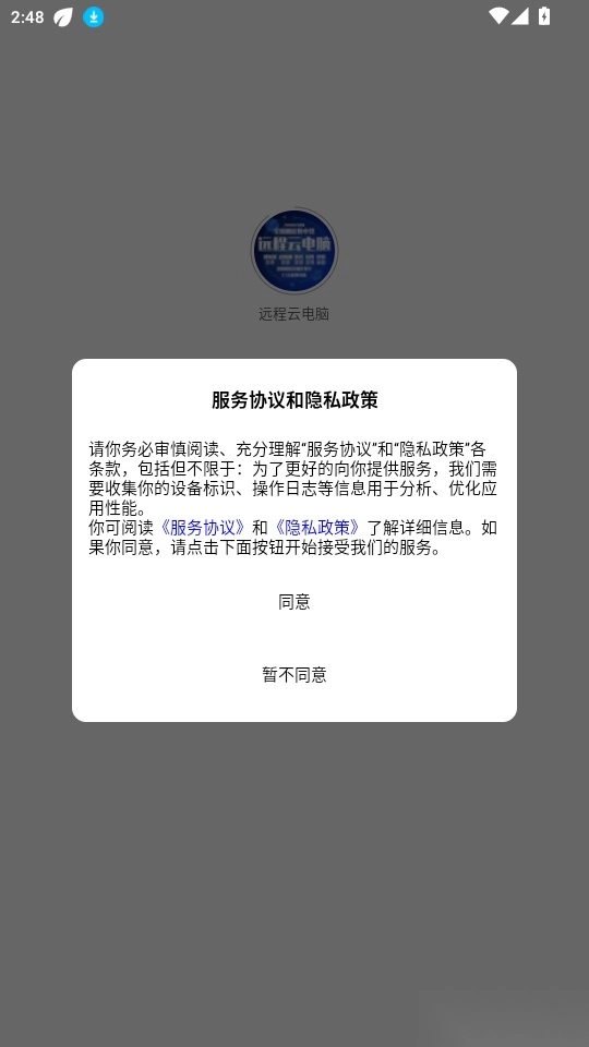 1. 启动软件后阅读“服务协议与隐私政策”,点击“同意”按钮进入下一步