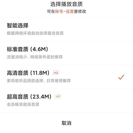 3、提供三种音质供您挑选,若选择超高音质,可收获优质体验。但需注意,超高音质仅面向VIP用户开放使用。
