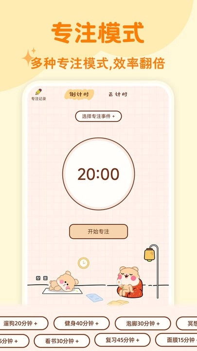 4、专注时钟:提供倒计时和正计时选项,计时结束提醒,每一次的专注计时都有记录,让你沉浸式工作学习生活。