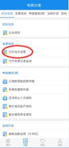 2、在新打开的页面中,找到办税功能板块,从中选择并点击【代开电子发票】这一选项。