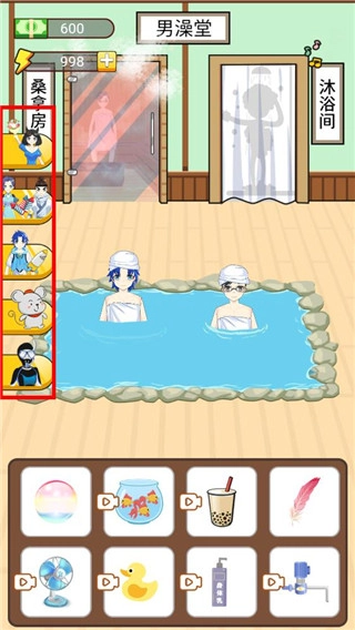进入澡堂后,点击屏幕左侧就能挑选不同的服务项目,还能选择不同的道具来进行体验。